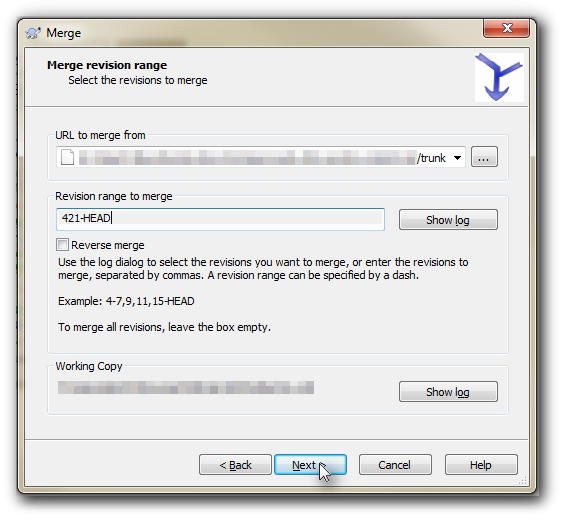 - In the Revision range to merge, the best approach is to be precise. Put in the last revision number that was merged (e.g. if you branched when the repository was at revision 10, put in 11-HEAD). You can leave this blank, but we want to avoid merging a change twice. You may need to look at the log to help find the right revisions.