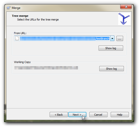 - In the “URL to merge from”, choose the trunk.