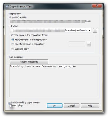 - In this scenario, you will also want to choose “switch working copy to new branch/tag”. We’ll be doing work on the new feature or design change immediately, so this tells subversion that any new commits will be on that other branch.